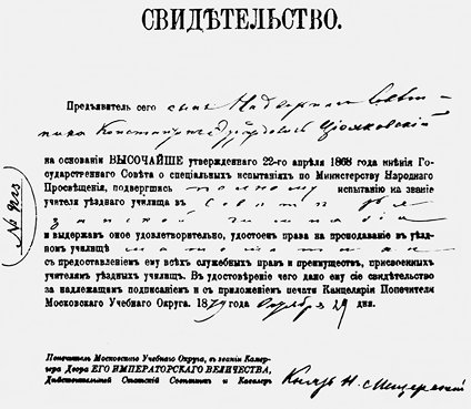 Свидетельство уездного учителя математики, полученное К.Э. Циолковским в Рязанской гимназии. 1879