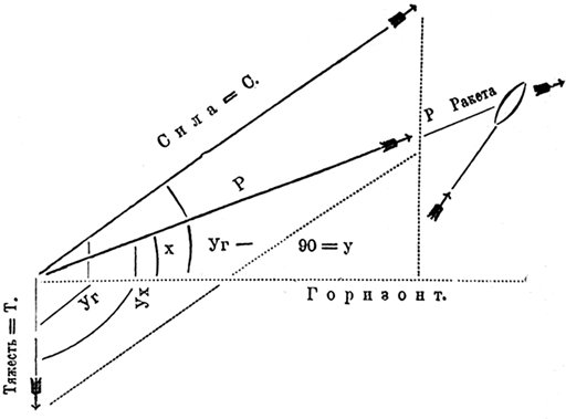 На ракету действует сила тяжести (Т), выражаемая секундным ускорением, затем сила взрывания по направлению длинной оси снаряда (С). Между направлениями этих сил образуется данный угол (Уг), больший 90°. Угол силы взрывания с горизонтом будет Уг – 90 = У. Это будут три данные величины. Неизвестны: направление движения ракеты, определяемое углом (Ух) или углом (X), и величина равнодействующей (P), т.e. секундное истинное ускорение снаряда (Р).