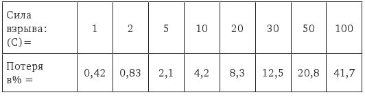 Как видно, отвесное движение сопровождается большой потерей энергии, в особенности, когда сила взрывания (С) невелика. Тут (С) должно быть больше (Т), в противном случае даже никакого движения не получится. Последняя строка выражает в процентах наибольшую соответствующую скорость. На самом деле скорость выражается второй строкой, потому что часть энергии пойдет на поднятие во время взрывания (доказано в 1903 году).