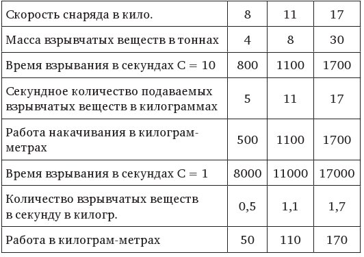 Из нее видно, что при самой малой силе взрыва (С = 1) и при наименьшей космической скорости (8 кило) работа вдавливания или накачивания ограничивается 50 килограм-метрами или половиною метрической силы. При самой же громадной космической скорости и удесятиренной силе взрыва (С = 10) работа достигает 17 метрических сил.