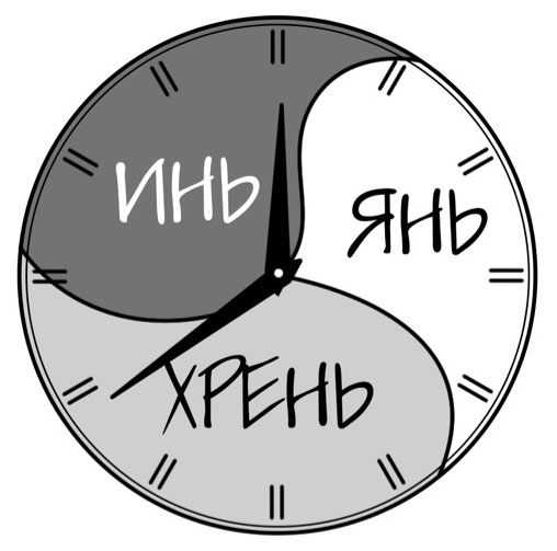 Однажды, прогуливаясь по торговой галерее, я заметил в одной из витрин настенные часы. Они привлекали внимание необычным циферблатом. Вместо привычных циферок и делений, стрелки часов гуляли по древнекитайскому символу двух начал «инь-ян». Только и сам символ был креативным, дополненный третьим началом – «хрень». «Инь-Янь[10]10