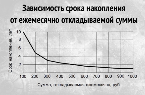 То есть во сколько раз мы увеличили сумму, которую способны откладывать ежемесячно, ровно во столько же раз мы уменьшили срок накопления капитала, необходимого для получения 100 руб. ежемесячного пассивного дохода. Наиболее наглядно это иллюстрирует следующий график.