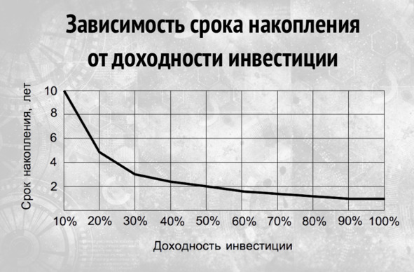 Во сколько раз мы увеличим доходность инвестиции, во столько же раз уменьшится срок накопления необходимого капитала. Ниже показан график этой зависимости.