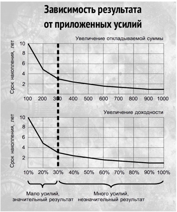 Если внимательно посмотреть на оба графика (увеличения дохода и увеличения доходности), легко заметить неравномерность уменьшения срока достижения финансовой независимости. Самый существенный результат достигается при повышении дохода в 2—3 раза или увеличении доходности до 20—30%. В обоих случаях срок достижения финансовой независимости уменьшается с 10 до 3,3 года. Все последующие усилия по увеличению как дохода, так и доходности лишь незначительно влияют на срок.