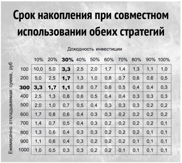 Каждая клетка таблицы соответствует сроку накопления в годах. Так, если инвестировать 300 руб. под 10% годовых, то для достижения пассивного дохода, равного 100 руб. в месяц, понадобится 3,3 года (40 месяцев).