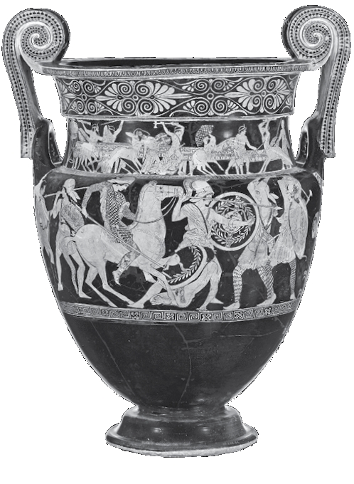 Чаша для смешивания вина и воды, изображающая битву между греками и амазонками. Ок. 450 г. до н. э.