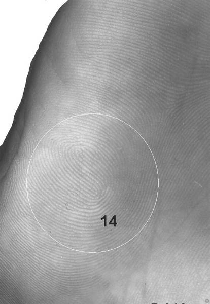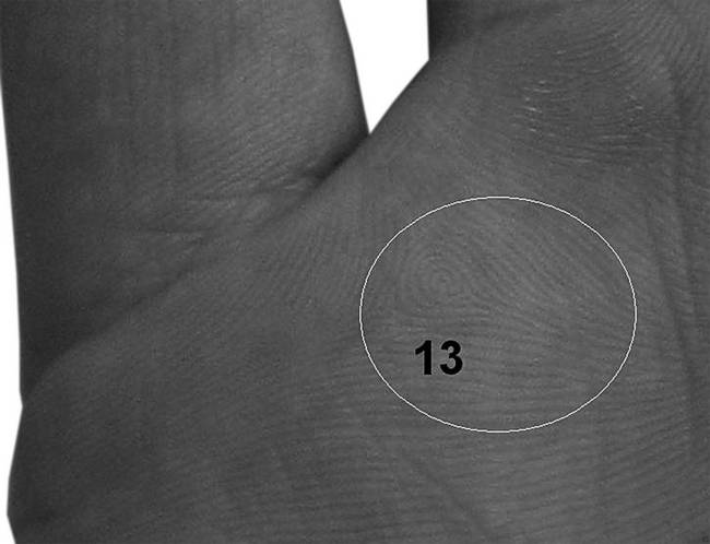 13. Завиток между холмами Аполлона и Меркурия (рисунок 1.114) находится между одноименными холмами и очень часто напоминает рисунок, который похож на павлиний глаз. Такой завиток на ладонях – большая редкость и связан со специфическими формами взаимоотношений, а также закрепощенностью и комплексом неполноценности. Вероятно, в прошлой жизни такой человек злоупотреблял силой в своих сексуальных домогательствах, а теперь, согласно закону Кармы, его прошлые вожделения и сексуальная невоздержанность оборачиваются против него. В настоящей жизни очень часто получается так, что человек как бы не принадлежит самому себе, и ему бывает очень трудно реализоваться из-за того, что его честолюбивые планы практически всегда встречают сопротивление. Зачастую такие люди сухи в выражении своих чувств, сексуально закомплексованны и жестоки, но очень сильно желают обрести самостоятельность, для того чтобы изменить свое тяжелое положение и вырваться из замкнутого круга.