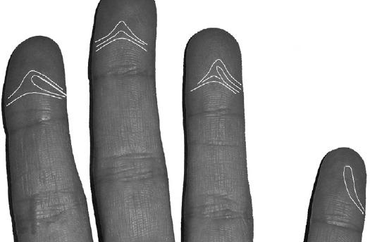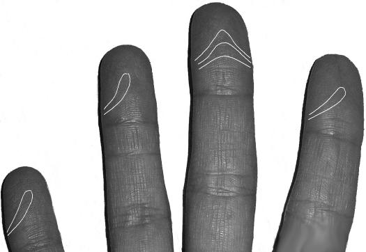 На рисунке 1.105 представлена рука с часто встречаемыми папиллярными узорами на ладонях человека, где наиболее распространенные выделены черным цветом, а менее распространенные – белым. Ниже будет дано описание каждого узора и приведены фотографии, как тот или иной узор выглядит на руках. Для наилучшего понимания начнем с описания петель, расположенных в подпальцевых зонах ладони.