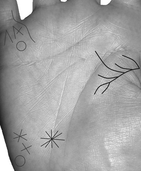 Звезда, крест или круг на холме Луны в комплексе с основными знаками суицида указывают на утопление в результате попытки самоубийства.
