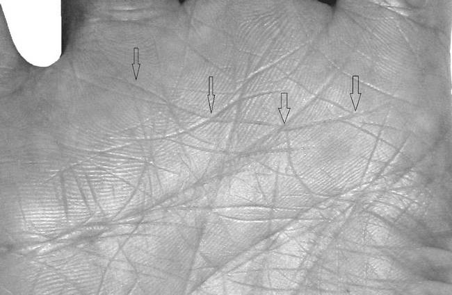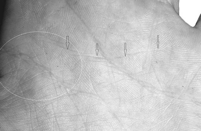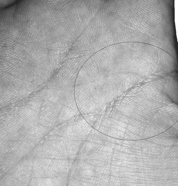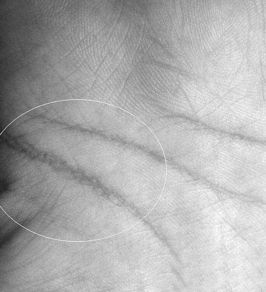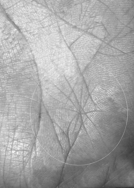 Линейные нарушения в межпальцевой зоне под холмами Аполлона и Меркурия над линией Сердца на уровне нетрадиционной ориентации выражаются в обильном скоплении в данной зоне линий, образующих повышенную «кустистость» (рис. 2.28 и 2.29), и различного рода островами или кругами, которые в сочетании с сильными и глубокими одинарными линиями образуют фигуры «воинов» или какие-либо другие неподдающиеся расшифровке или нечитаемые комбинации (рис. 2.30). Обязательными условиями, которые должны соблюдаться в первом случае – это присутствие под «кустистостью» на линии Сердца небольшого острова, а также количество линий собирающихся в «куст» должно быть более 5–7 линий. Во втором случае присутствие острова на линии Сердца под фигурами не является обязательным, так как данные фигуры сами по себе уже являются сильнейшими негативными знаками.