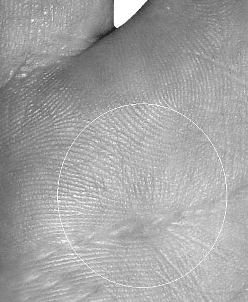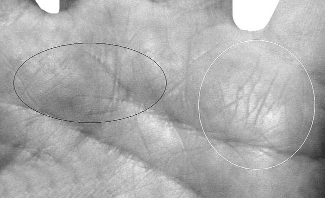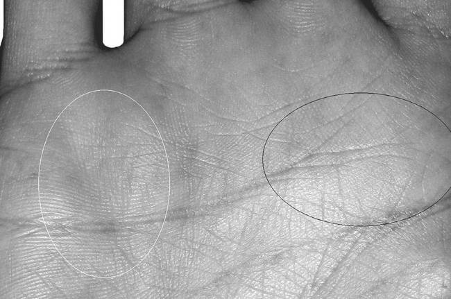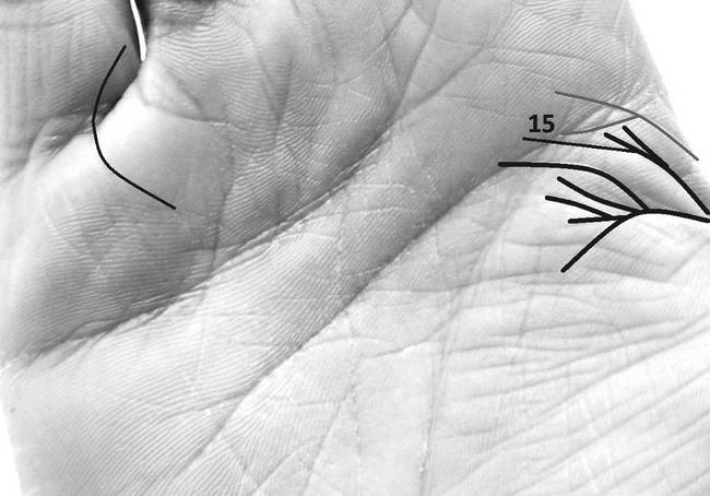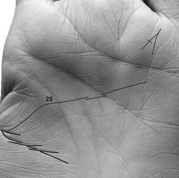 Конус на холме Меркурия в комплексе с основными знаками суицида сообщает об удушении, через которое человек сводит счеты с жизнью. Перечеркнутый конус в данной области указывает на сорвавшуюся попытку повеситься. В качестве примера на рисунках 2.23 и 2.23–1 приведена рука девушки, которая пыталась повеситься в 28 лет, где ответвление от «ветвистой» Раху маркирует возраст события, а перечеркнутый конус указывает на несостоявшуюся попытку удушения.