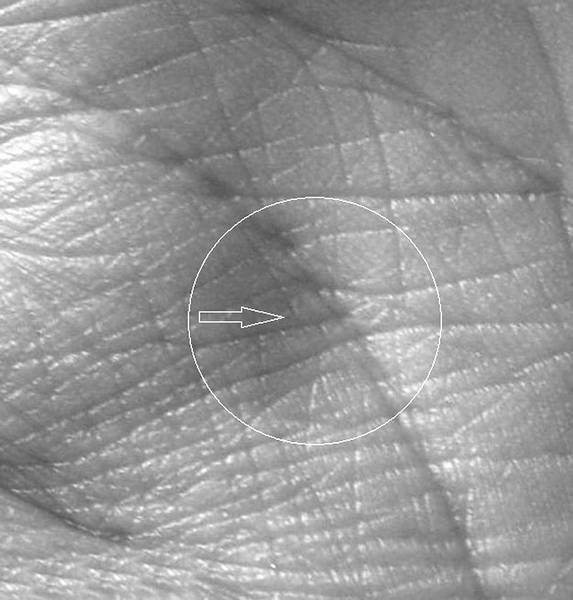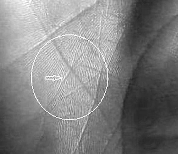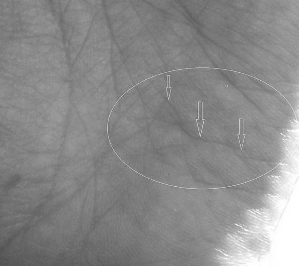 Неврит отображается кружками образованными папиллярными линиями под основанием безымянного пальца.