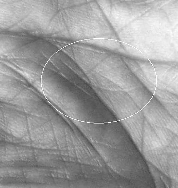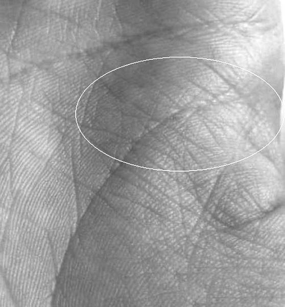 Знак мозжечка проявляется на ладони островом, прерывающим папиллярные линии в большом треугольнике. Травма мозжечка вследствие внешних воздействий или предрасположенность к эпилепсии отображается дополнительным островом, расположенным в знаке мозжечка (рис. 1.79).