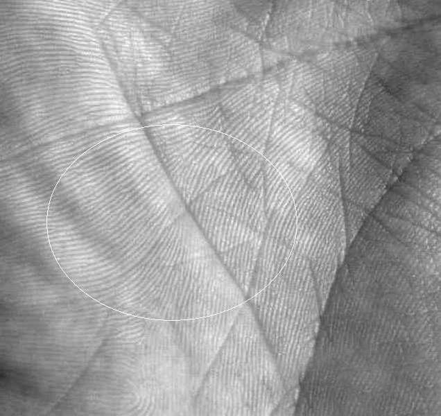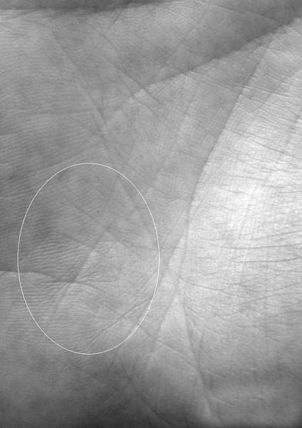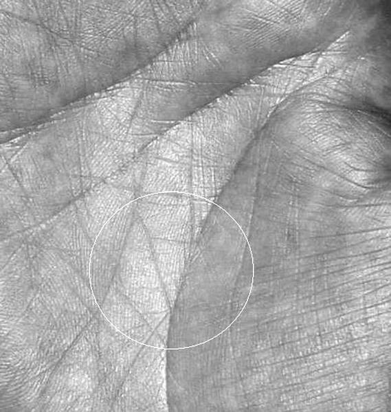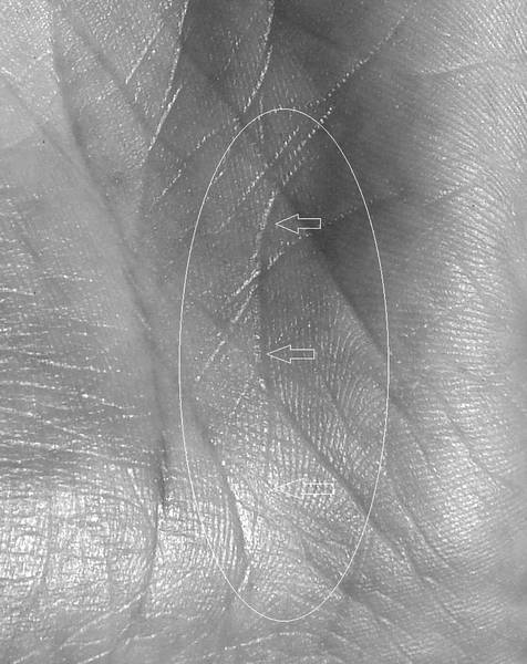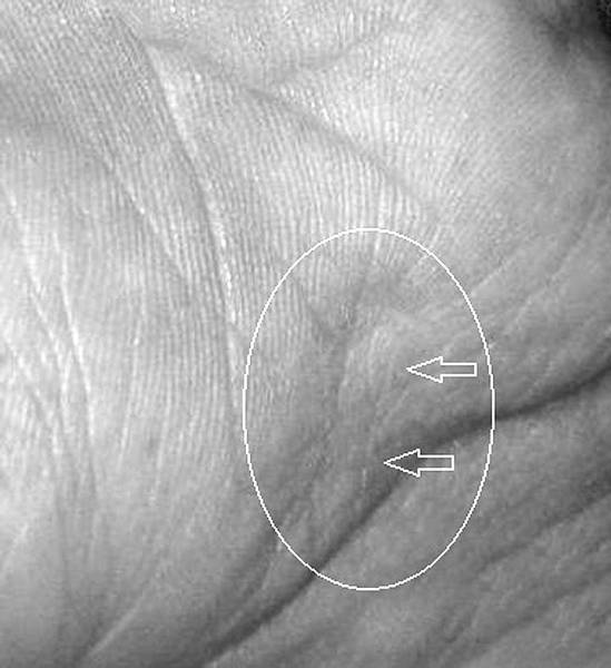 Под средним пальцем находятся кости таза, под безымянным – бедро, под мизинцем – голень, а остаток линии Головы относится к стопе, при этом любые повреждения основной линии в этих местах связываются с повреждением конечностей. В качестве примера работоспособности данной методики на рисунке 1.93 приведена рука человека получившего перелом плеча (поврежденный участок линии Головы находится под межпальцевым промежутком указательного и среднего пальцев), а на рисунке 1.94 – перелом шейки бедра (поврежден участок линии Головы под безымянным пальцем).