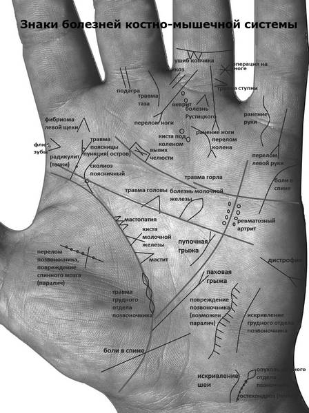 Проекционная зона костно-мышечной системы человека распределена по всей ладони. Основные повреждения позвоночника, его грудного и поясничного отделов выводятся на линию Жизни, а также в область вне пределов большого треугольника снизу ладони. Проблемы с шейным отделом позвоночника отображаются внизу ладони у расцетт между холмами Нептуна и Плутона, а с копчиковым – на третьих фалангах безымянных пальцев обеих рук. Повреждения конечностей выводятся на линию Головы, а также в подпальцевые зоны безымянного пальца и мизинца. Болезни груди отображены на линии Жизни в проекционной зоне груди в большом треугольнике, а знаки болезней, проявляющиеся при паховых и пупочных грыжах, будут располагаться по обе стороны от линии Здоровья (рис. 1.85).