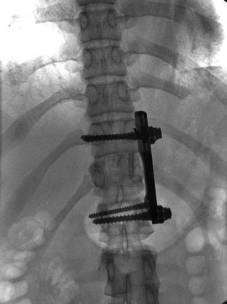 Повреждение позвоночника (с опасностью паралича) проявляется на ладони извилистой линией, проходящей вне пределов большого треугольника в проекционной зоне грудного отдела позвоночника, выпускающей мелкие линии в направлении холма Луны. На рисунке 1.88 приведена рука молодой девушки с переломом грудного отдела позвоночника, который произошел в результате ДТП, а на рисунке 1.88–1 – ее рентгеновский снимок, который был сделан спустя год с момента данного события. При сравнении знака на ладони с металлическим фиксатором в позвоночнике девушки бросается в глаза наглядное сходство вставленной в позвоночник пластины со схематически прорисованным на ее ладони знаком в соответствующей проекционной области. Подобное совпадение помимо визуального сходства указывает еще и на сильные физические страдания и боли в позвоночнике по настоящее время, о которых говорит глубокий и не спешащий сойти с руки знак. Помимо данного знака на ладони присутствует еще и общий признак травмы грудного отдела позвоночника, выраженный в резком смещении серединного участка линии Жизни в сторону холма Венеры.