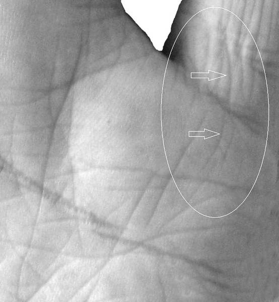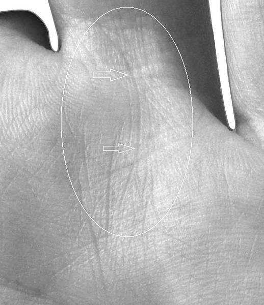 Также повреждение грудного и поясничного отделов позвоночника может отображаться глубоко прорисованным крестом на Нижнем холме Марса или в верхней части холма Венеры, имеющим глубокие темные точки на горизонтальной линии, где непосредственно сами точки и будут указывать на травму позвоночника, его перелом или повреждение спинного мозга, в результате которого наступает паралич.