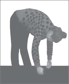 Взгляд вниз, в пол, и наклон голова к полу и руки падают вниз, к ногам. Хотелось бы, чтобы руки сгибались в наклоне так, как если бы собирали, сгребали с пола пух или сухие листья и подкидывали их вверх в тот момент, когда вы выпрямляетесь…