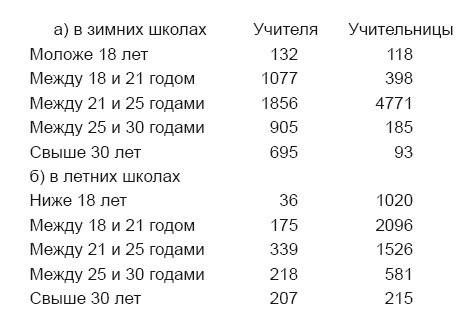 В этом же самом отчете говорится, что из всего числа учителей в зимних школах 665 учителей и 243 учительницы учили в одной и той же школе в течение целого года, 338 мужчин и 112 женщин – в продолжение 2 лет и 285 мужчин и 82 женщины – в продолжение 3 лет, все же остальные служили менее одного года.