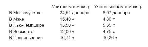 При жалованьи деревенским учителям всегда различаются собственно жалованье, уплачиваемое всегда деньгами, и стол и квартира (board), которые часто даются натурою. Деньги штата могут быть употреблены только на жалованье. Вот за 1848 г. таблица жалованья деревенских учителей в различных штатах: