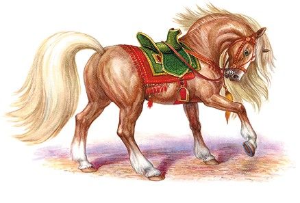 [Закрыть] грызёт, шею, словно лебедь, гнёт, копытом землю роет. Грива на шее волной, сзади хвост трубой, меж ушей – чёлка, на ногах – щётка; шерсть серебром отливает. Во рту удила, на спине седло, стремена золотые, подковки стальные.