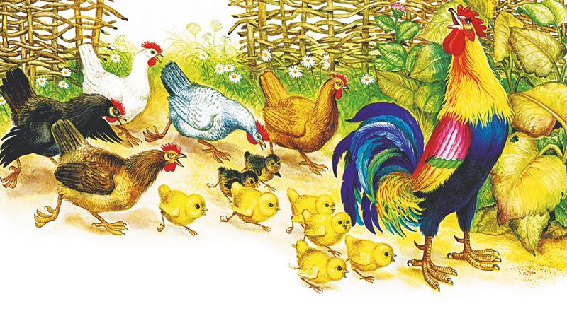 Курочки с цыплятками собирались, раскудахталися; зёрнышком не поделились – передралися. Петя беспорядков не любит – сейчас семью помирил: ту за хохол, того за вихор, сам зёрнышко съел, на плетень взлетел, крыльями замахал, во всё горло заорал: «Ку-ку-ре-ку!»