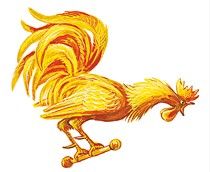 Ходит по двору петушок: на голове красный гребешок, под носом красная бородка. Нос у Пети долотцом, хвост у Пети колесцом; на хвосте узоры, на ногах шпоры. Лапами Петя кучу разгребает, курочек с цыплятами созывает: