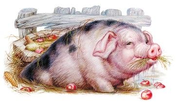 Рыло у хавроньюшки не нарядное: в землю носом упирается, рот до ушей; а уши, словно тряпки, болтаются; на каждой ноге по четыре копыта, а ходит – спотыкается. Хвост у хавроньюшки винтом, хребет – горбом; на хребте щетина торчит. Жрёт она за троих, толстеет за пятерых; зато её хозяюшки холят, кормят, помоями поят; а вломится в огород – поленом прогонят.