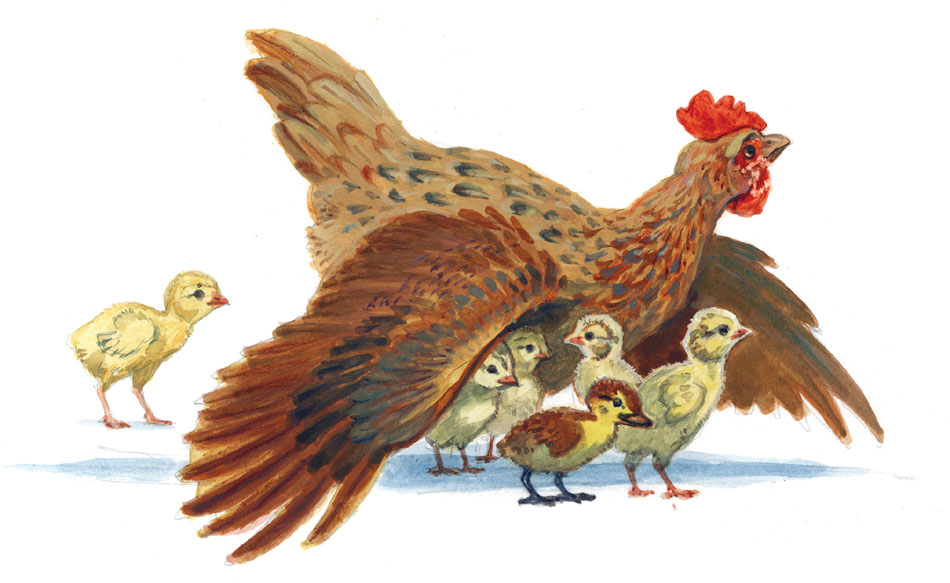 Позже всех проклюнулся цыплёнок из зеленоватого яичка. И какой же странный он вышел, кругленький, пушистый, жёлтый, с коротенькими ножками, с широким носиком. «Странный у меня вышел цыплёнок, – думает курица, – и клюёт, и ходит-то он не по-нашему; носик широкий, ноги коротенькие, какой-то косолапый, с ноги на ногу переваливается». Подивилась курица своему цыплёнку, однако же какой ни на есть, а всё сын. И любит, и бережёт его курица, как и прочих, а если завидит ястреба, то, распустивши перья и широко раздвинув круглые крылья, прячет под себя всех своих цыплят, не разбирая, какие у кого ноги.