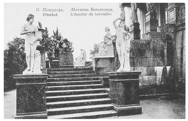 Дворец Бельведер в петергофском Луговом парке. Открытка начала XX века. Герои «Козлиной песни» проводят время за прогулками по паркам и улицам Петергофа[6]6