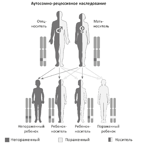 Мутация гена на одной из первых 22 пар неполовых хромосом может привести к расстройству, называемому аутосомным. Наследуемые аутосомные генетические мутации обычно бывают либо доминантными, либо рецессивными. Если мутация доминантная, то требуется лишь одна копия гена от одного родителя, чтобы проявились внешние признаки расстройства, называемые фенотипом. В данной ситуации как минимум один из родителей будет иметь физические проявления расстройства, т. е. фенотип. Рецессивная генетическая мутация происходит тогда, когда аномальный ген (унаследованный от одного родителя) не доминирует над нормальным геном (унаследованным от второго родителя); человек не имеет внешних проявлений аномального фенотипа, однако является носителем аномального гена, который может передать своим детям. Если аномальный ген наследуется от обоих родителей, у потомства появляются внешние признаки расстройства. Синдром Ларона – одно из таких аутосомно-рецессивных расстройств.