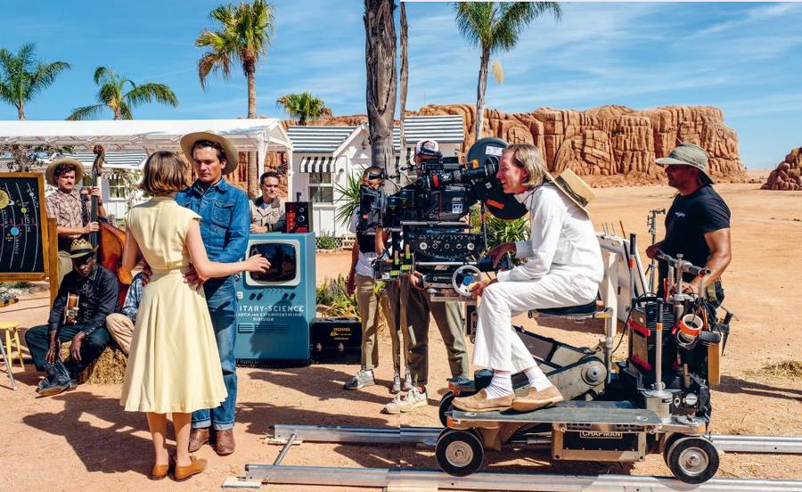 Руперт Френд (в ковбойской шляпе) и Мэтт Диллон (за его спиной, за стойкой) под прицелом камеры Уэса Андерсона на съемках фильма «Город астероидов»