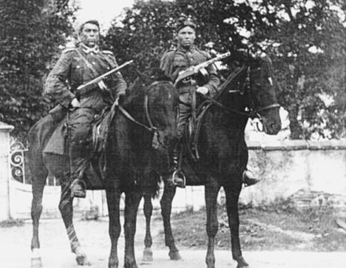 Солдаты 623-го казачьего батальона позируют фотографу. В августе 1943 г. это подразделение входило в состав немецкой группы армий «Центр» на Восточном фронте. Немцы высоко ценили казаков как прекрасных кавалеристов и разведчиков. Обратите внимание – они вооружены автоматами советского производства