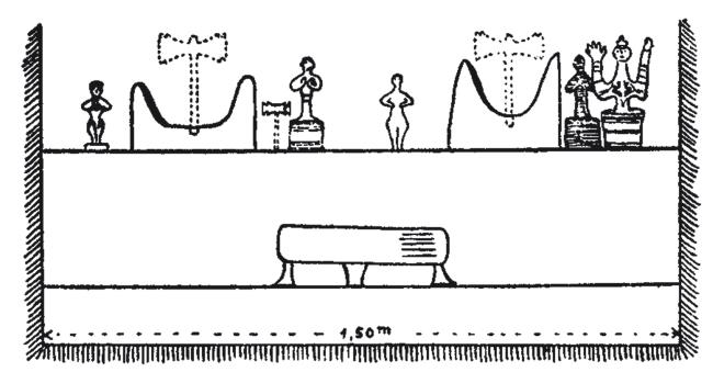 Реконструкция культовой ниши в Кноссе, обнаруженной Эвансом. Рядом с глиняными идолами стилизованные бычьи рога, между которыми когда-то находился небольшой двуглавый топ