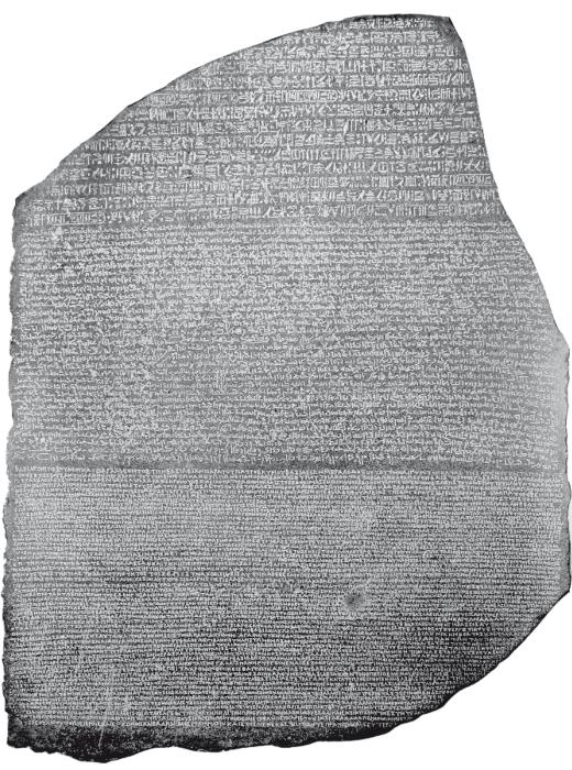 Обнаруженная в развалинах крепости плита, величиной со столешницу, была вытесана из мелкозернистого черного базальта и с одной стороны отполирована. На ней проступали три надписи, три колонки знаков, полустертых в результате выветривания, под воздействием миллионов песчинок, тысячелетиями царапавших поверхность камня. Из трех надписей первая, в 14 строк, была иероглифической. Вторая, в 32 строки, – демотической. Наконец, третью, в 54 строки, начертали по-гречески.