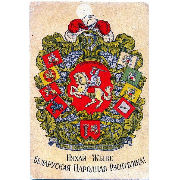 Почтовая карточка с гербом БНР в обрамлении хоругвей воеводств исторических беларуских территорий