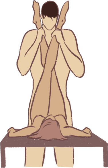 Эта позиция очень похожа на ту, где вы с любовником располагаетесь стоя у опоры. Только в данном случае ты ложишься на достаточно высокую поверхность, например на стол. Свои ножки скрещиваешь и кладешь мужчине на плечи. Пусть он нанесет на пенис смазку и направит его между твоими бедрами, тесно прижимая к губкам вагины и лаская клитор. Ты можешь помочь своему любовнику руками.