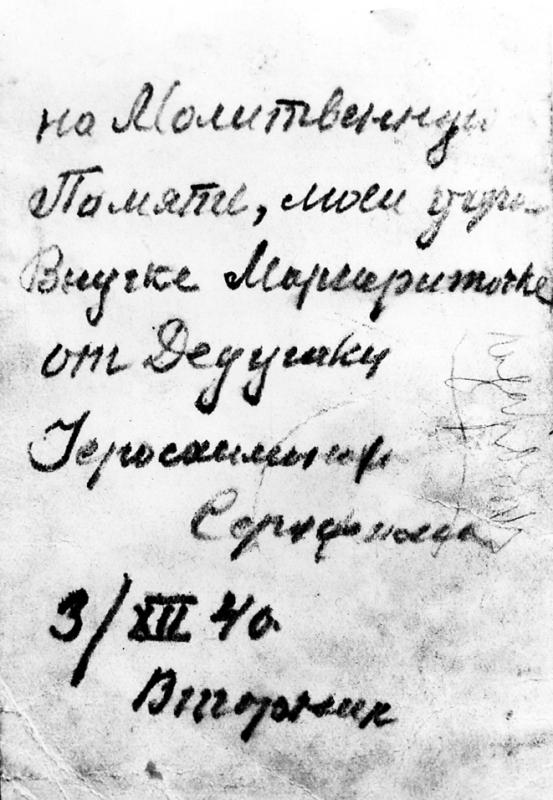 У меня сохранилась фотография отца Серафима, которую он подарил бабушке, с надписью, сделанной его рукою: «От иеросхимонаха Серафима духовной дочери Александре». Во время пожара, когда все наши вещи в квартире сгорели, уцелел лишь бабушкин паспорт, в котором находилась фотография отца Серафима. Края ее обгорели, она немного потемнела, но практически осталась нетронутой. Я храню ее и всегда ношу с собой…