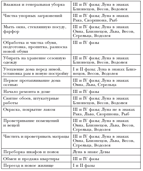 У каждой женщины предостаточно дел по дому и, конечно, невозможно отложить их все до наступления дней убывающей Луны, особенно если у вас большая семья. Но, как ни странно, чем больше этой работы вы будете откладывать именно на III и IV фазы Луны, тем меньше времени она будет у вас занимать и тем больше удовольствия вы получите от ее исполнения. А это лучше, чем делать все дела через силу. Это, в свою очередь, заставит вас пересмотреть свой распорядок дня, чтобы как можно более полно использовать преимущества правильно выбранного времени для домашних хлопот.