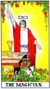 Перед юношей на столе лежат таинственные, волшебные предметы. Это символы всех четырех стихий, четырех мастей Таро: кубок, посох, меч, пентакль. Фактически это означает умение пользоваться благами и силой всех стихий, умение ими управлять. Волшебные инструменты в руках знающего человека делают из него мага. Карта так и называется: «Маг».
