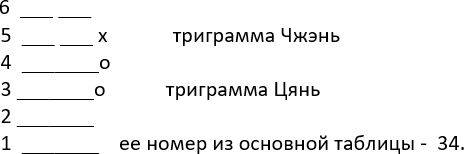 В исходной гексаграмме № 34 подвижные черты 3,4,5, с ними и нужно познакомиться.