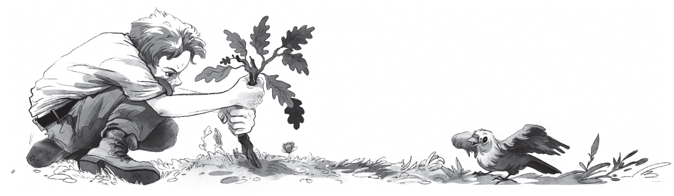 Однажды шёл мальчик по дороге. А тут как громыхнуло что-то! Гроза. И дождь полил. А мальчик без зонта. Пошёл он быстрее. Вдруг видит: на зелёном газоне маленький-маленький дубок растёт, едва до колена. Ствол у него чёрный-чёрный. И листья торчат в разные стороны. «Это же не дело, – подумал мальчик, – что дубок не на месте. Дубы должны или в лесу расти, или когда их в городе специально высадят – ровно. Так, чтобы аллея получилась». И пошёл по скользкой траве, чтобы этот дубок вырвать. Только за чёрный ствол схватился – чувствует, как будто прилип к нему. Обхватил мальчик дубок руками покрепче и потянул. Но что такое? И дубок мальчика не отпускает. Мальчик тянет – не может руку оторвать. Да ещё и ноги по траве скользят – опоры нет. А сверху дождь льёт.