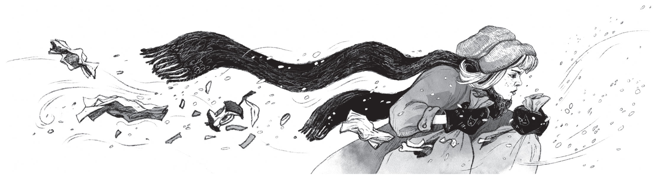 А снег всё падает. Ветер его носит. Шмяк! – прямо девочке в лицо. Шмяк! Ничего девочка за снегом не видит. Лицо трёт. И вдруг чувствует, что рукой, которая без варежки, как будто по снежному кому водит.