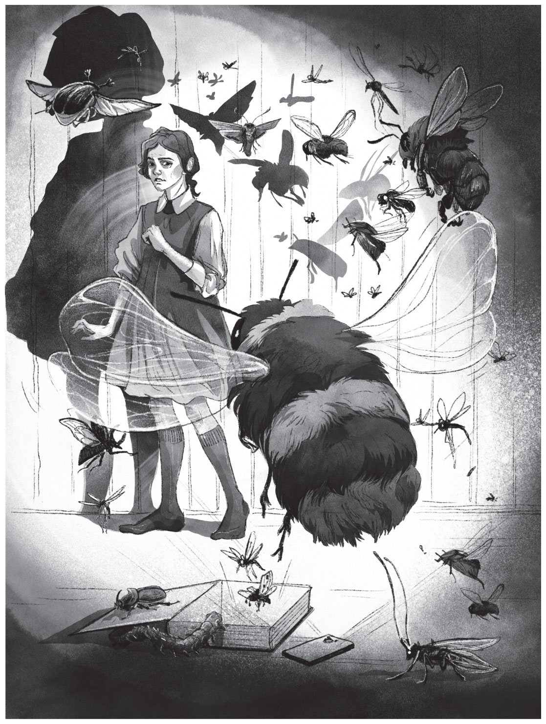 Загудели насекомые, затрещали, по комнате заметались. О люстру стукаются, в стены врезаются. Стулья уронили, шкаф раскачали. Кто жалит девочку, кто крыльями бьёт, кто кусает.