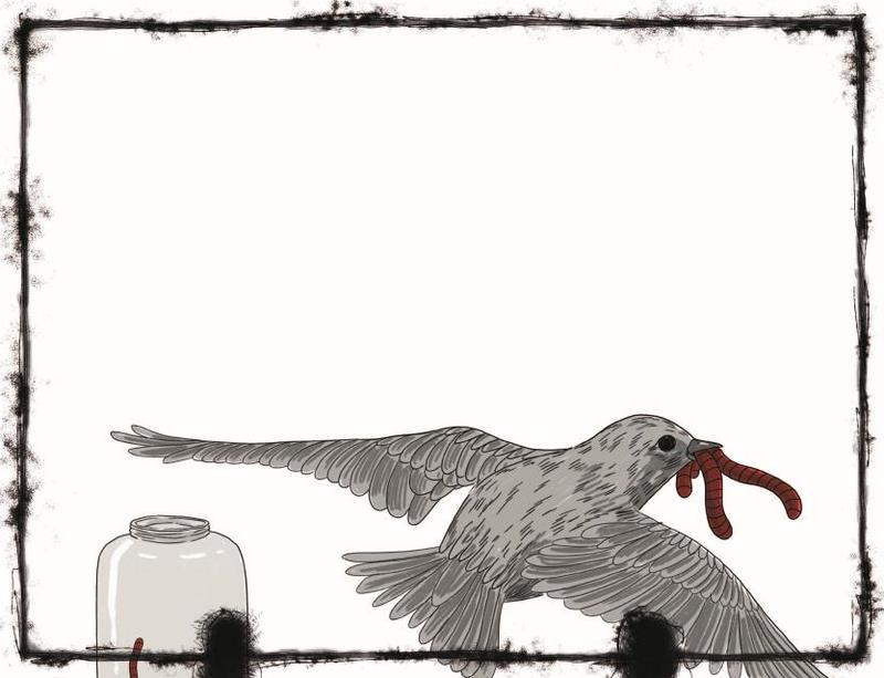 А в последнюю из квартир зашли – очень темно. Как ночью. И окна плотными шторами завешены, только ветер из открытой створки их дёргает. Прошли в комнату, а там на столе – банка с дождевыми червями. Открытая. Но черви из неё выползти не могут, на дне друг по другу ползают. Медлительные, полуживые уже. Рядом с банкой – заморённые бабочки, приколотые булавками, и засушенные жучки в бумажных пакетах. А в самом дальнем и тёмном углу, на комоде, чучело соловья. Страшное, неумело сделанное. Вместо глаз – чёрные бусины, перья топорщатся, клюв раскрыт.