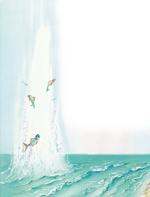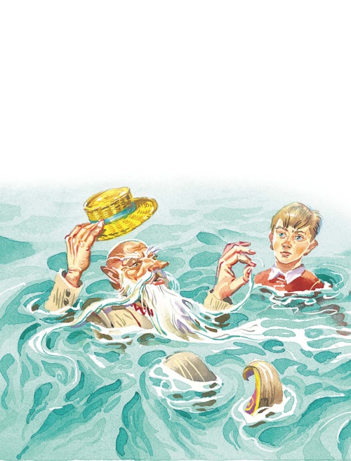 – Пожелайте мне скорой удачи, ты, о Волька, и ты, о Серёжа, и ты, о Женя! – воскликнул Хоттабыч и, превратившись в рыбу, с плеском нырнул в воду.