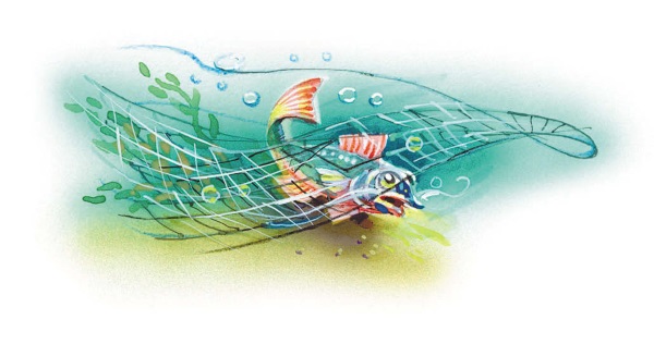 Набрав сколько надо на похлёбку, он хотел уже возвращаться на берег, когда взор его случайно упал на сложенные возле мачты рыболовные сети. Одинокая рыбка билась в них, то замирая, то с новой силой возобновляя свои бесплодные попытки освободиться.