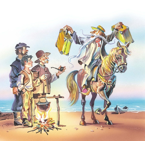 – Это ты ошибаешься, о бескорыстный рыбак. В этих чемоданах заключены богатства, в тысячи тысяч раз превышающие стоимость вашей похлёбки, и всё же они, на мой взгляд, не будут достаточной оплатой за неё, ибо нет на всём свете более дорогого, чем бескорыстное гостеприимство и милосердие к нуждающимся.