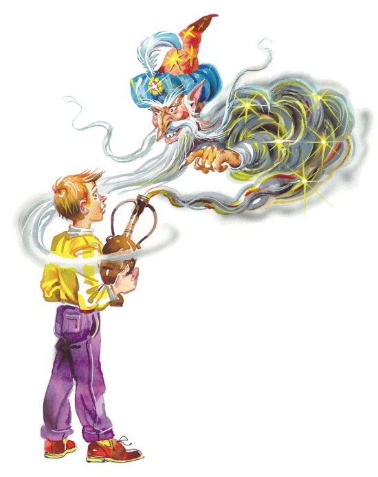 – Так смотри же и убеждайся! – заревел джинн, встряхнулся, стал дымом и начал постепенно вползать в кувшин под тихие аплодисменты обрадованных ребят.