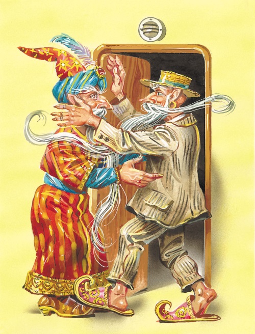 – Что это за старик? – осведомился Хоттабыч, увидев лежавшего на койке, жалобно стонавшего старца, бывшего ещё несколько минут назад тринадцатилетним мальчиком Серёжей. – И это что за старик? – продолжал он, указывая на Омара Юсуфа, но тут же побледнел и, не веря своему счастью, сделал несколько неуверенных шагов вперёд и тихо пробормотал: – Селям алейкум, Омарчик!